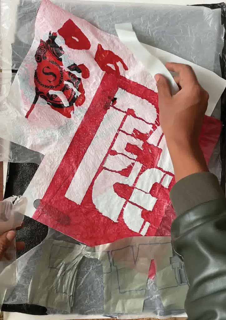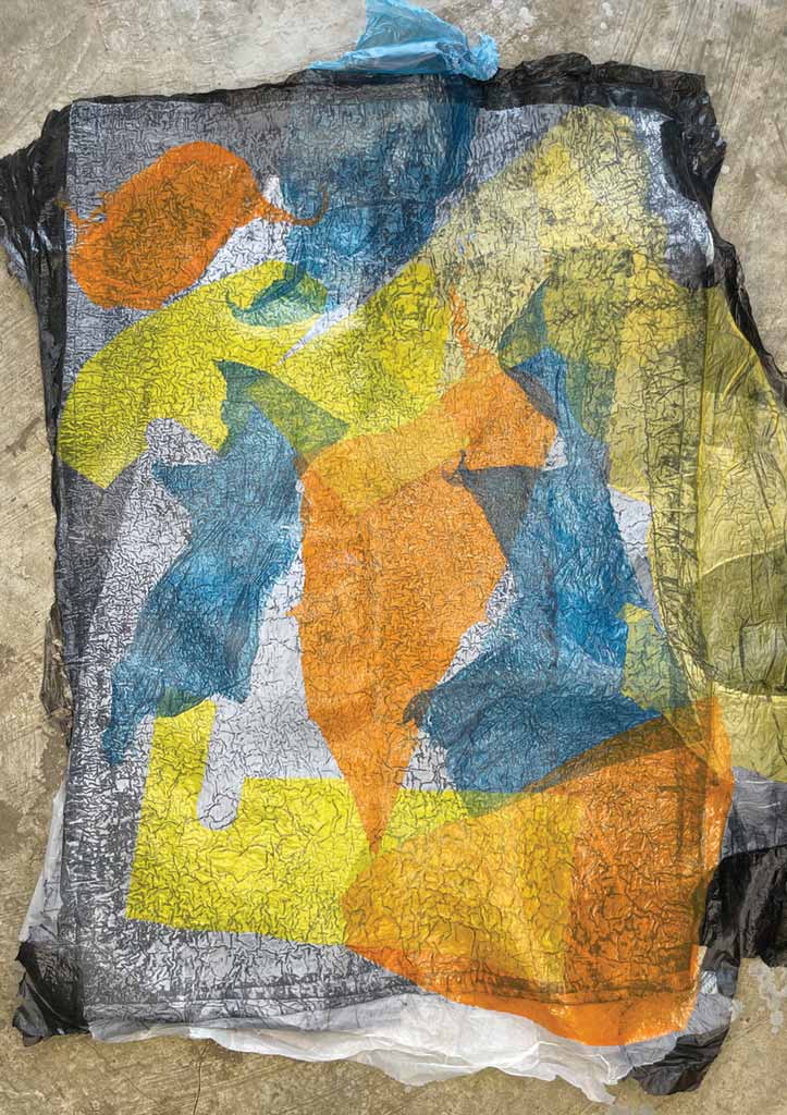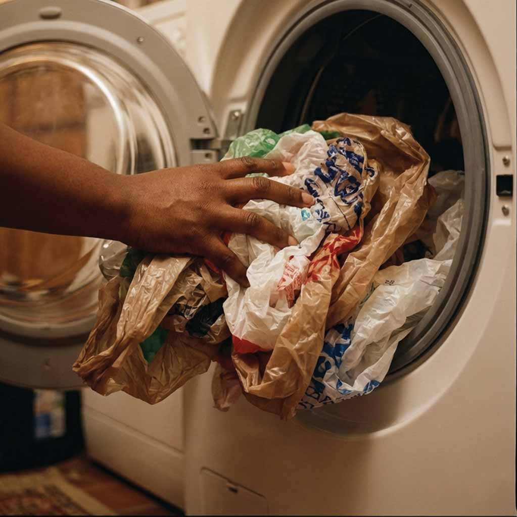 The plastic bags are thoroughly washed and air-dried to clean the material while preserving its original texture and character.