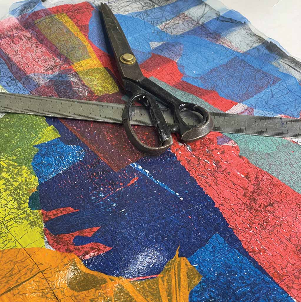I compose each surface one at a time, cutting and layering pieces like a collage or painting so no two bags are ever the same.